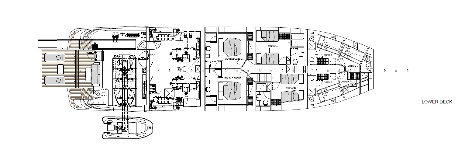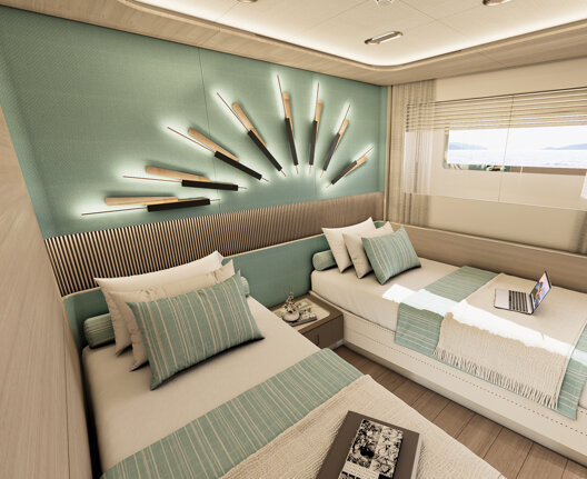 Размещение: до 12 гостей (10 + 2) и 6 человек экипажа (5 + 1). Пространства включают главный салон, столовую, камбуз, мастер-каюту, VIP- и twin-каюты, лобби, рубку и навигационный пост.