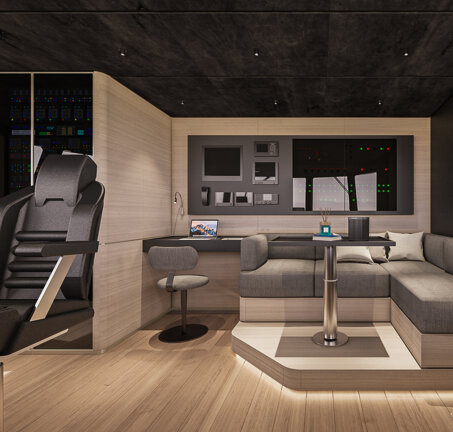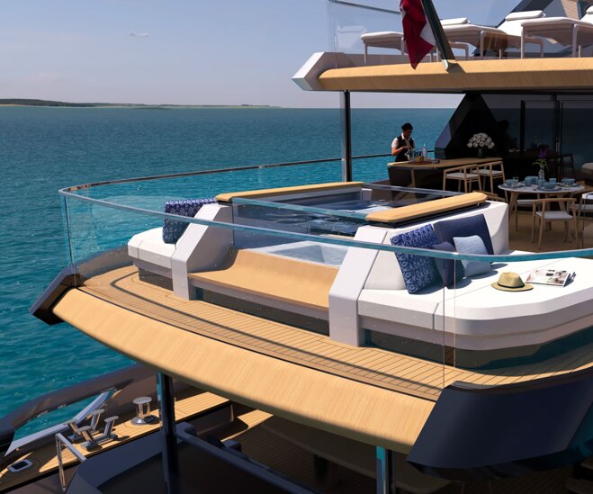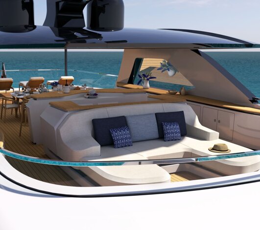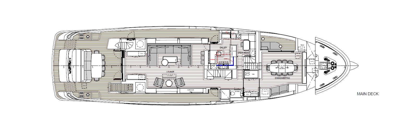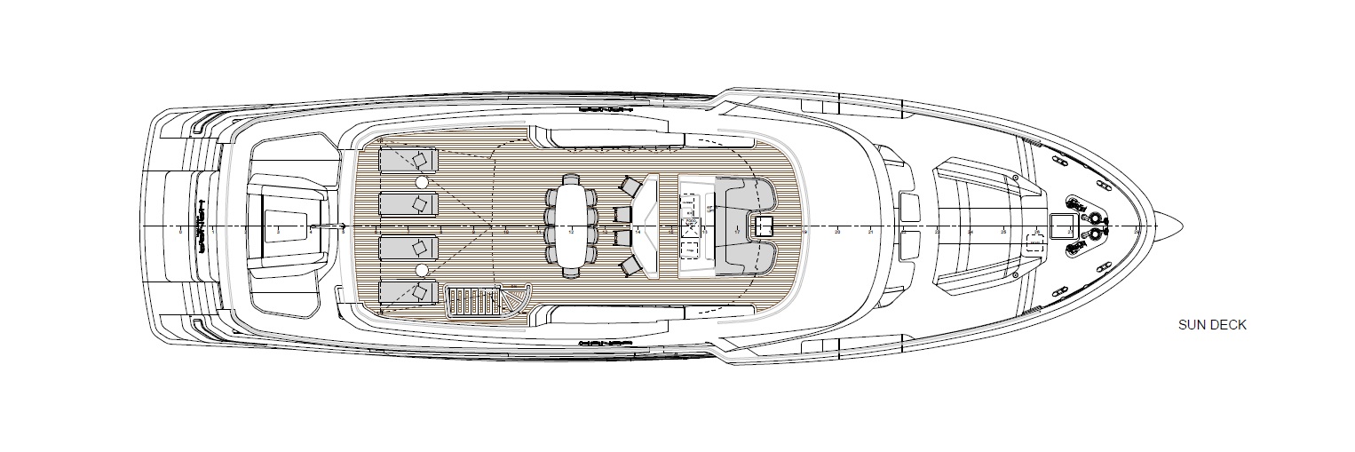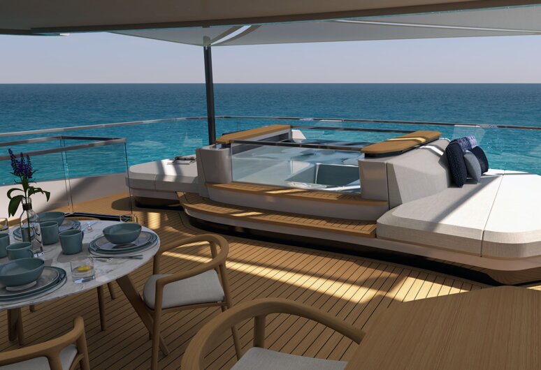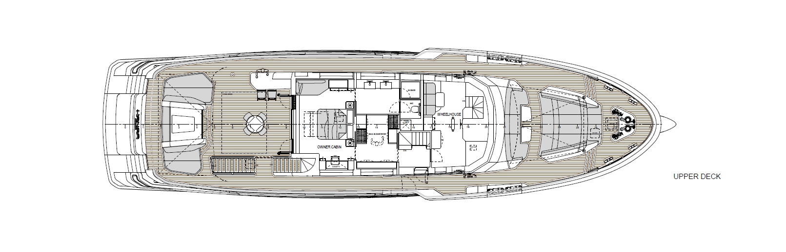 Зоны на борту: пляжный клуб — около 20 м², гараж для тендера — 25 м², солнечная палуба — 79 м², фордек — 29 м², рубка — 15 м². Владельческая каюта — порядка 120 м².