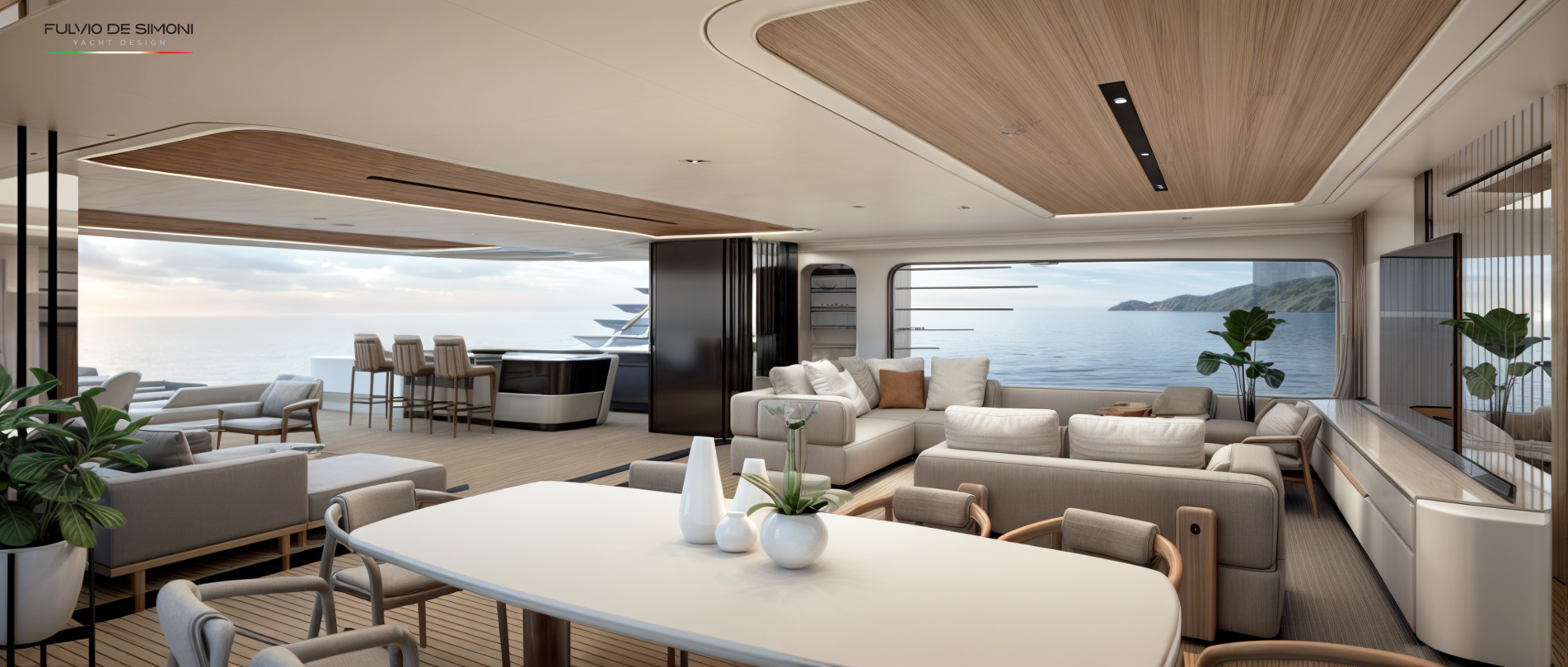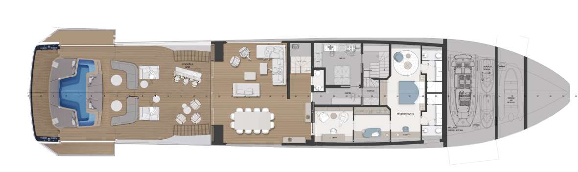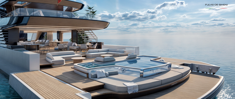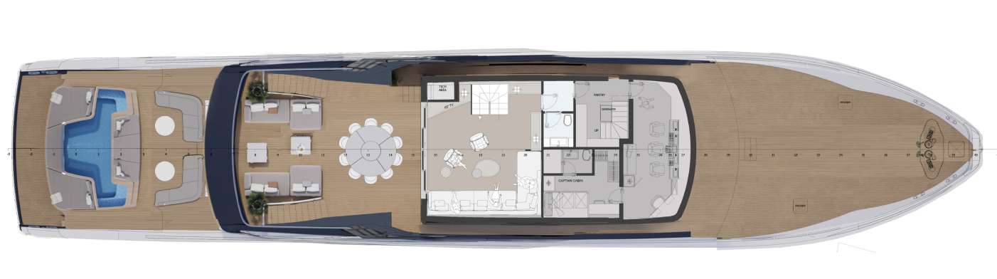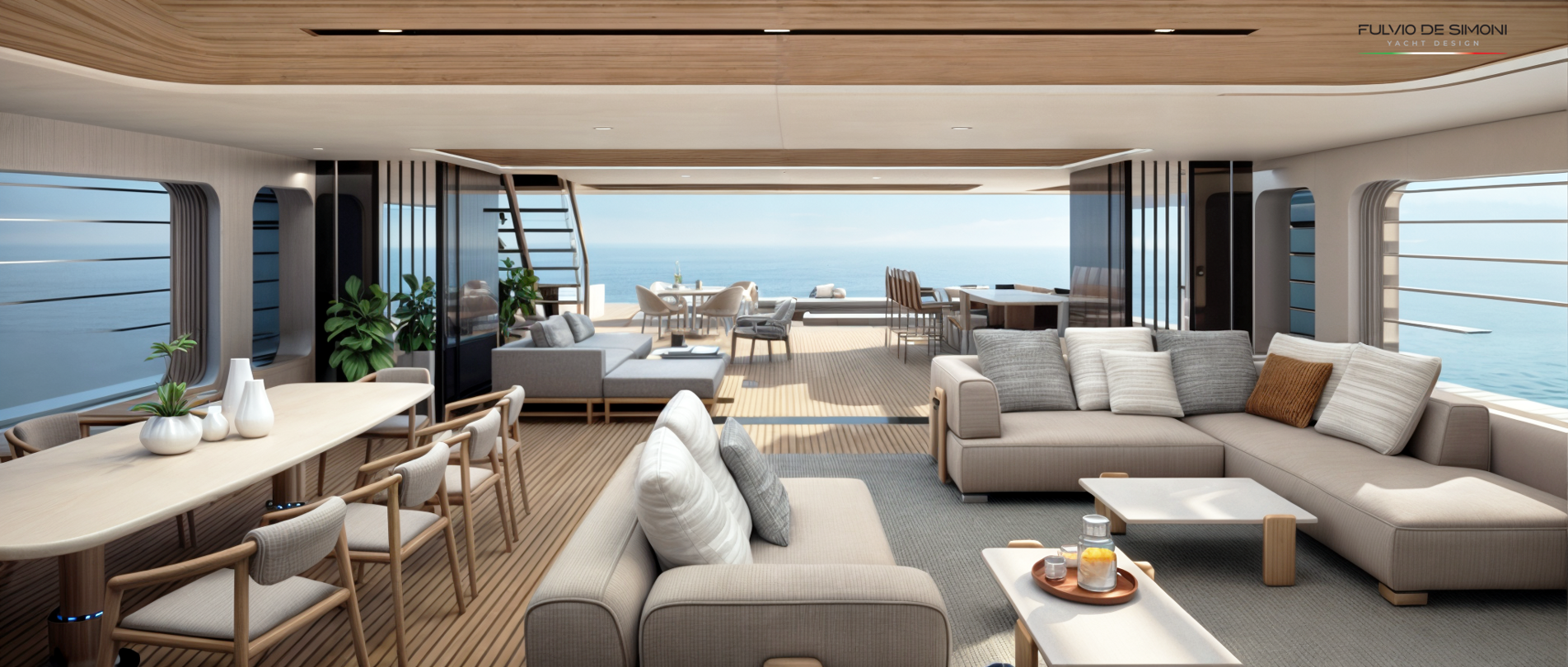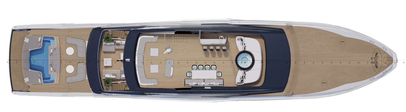 — Главная палуба — бесшовная стыковка салона и кормового лаунжа, без жёсткой границы «дом—улица», с полностью открываемой боковой и кормовой частью.
