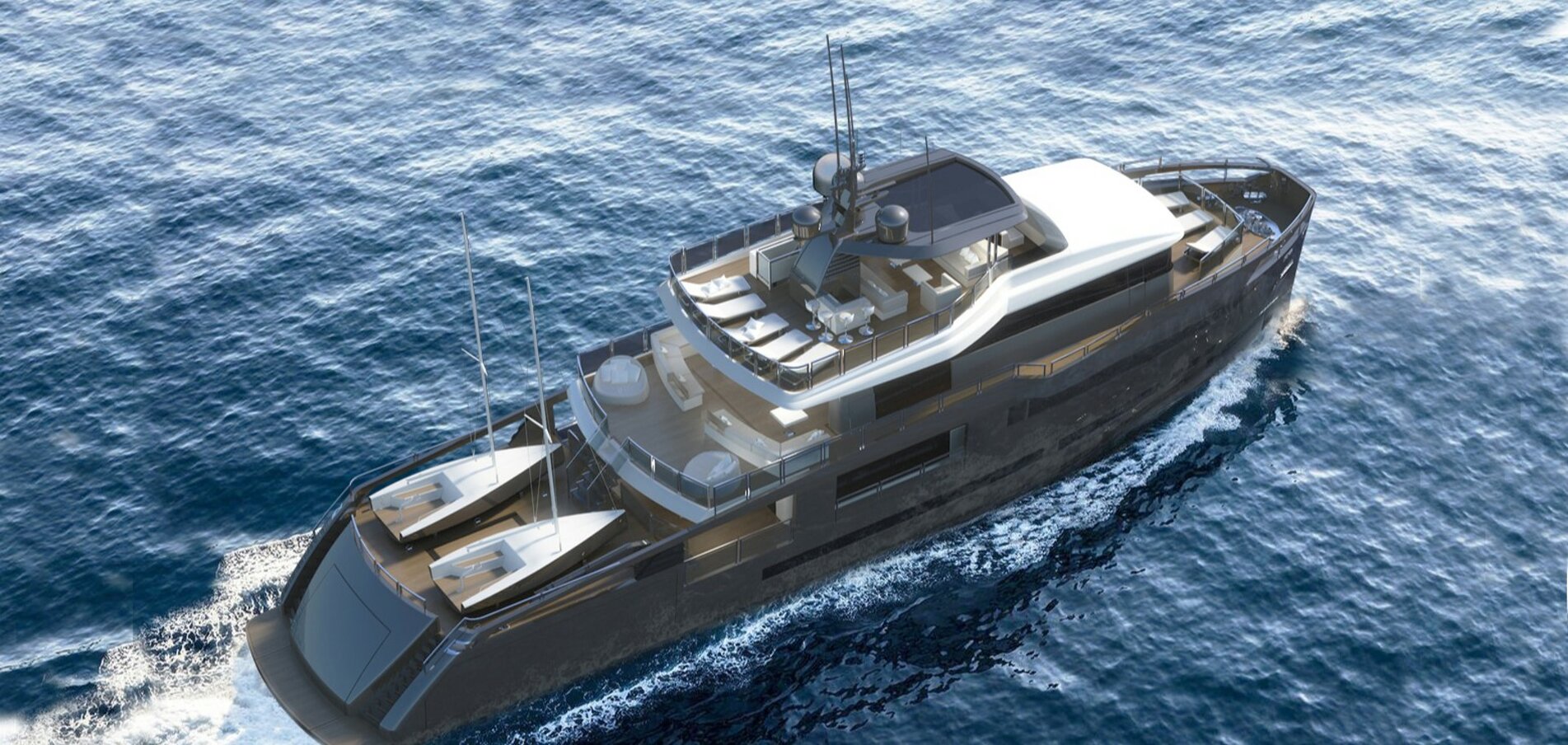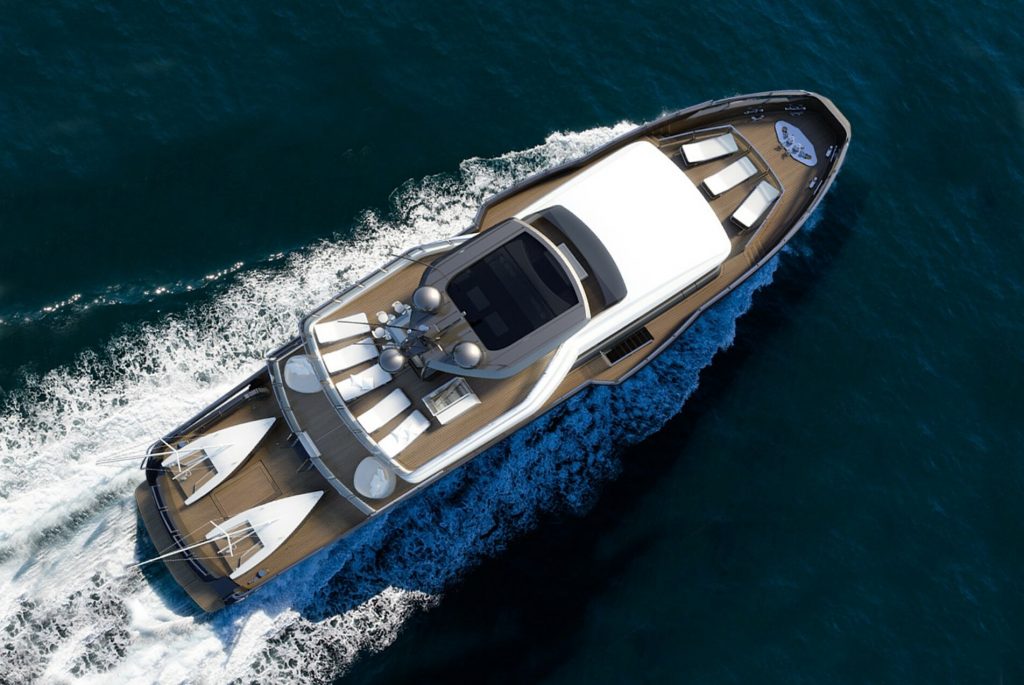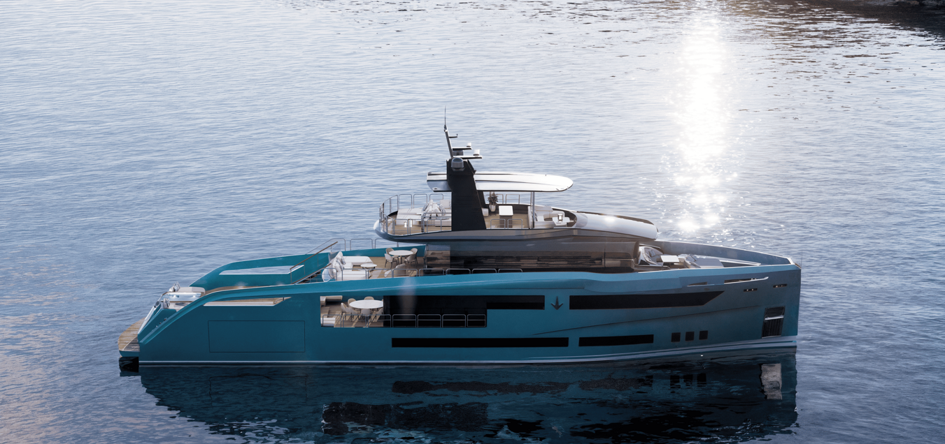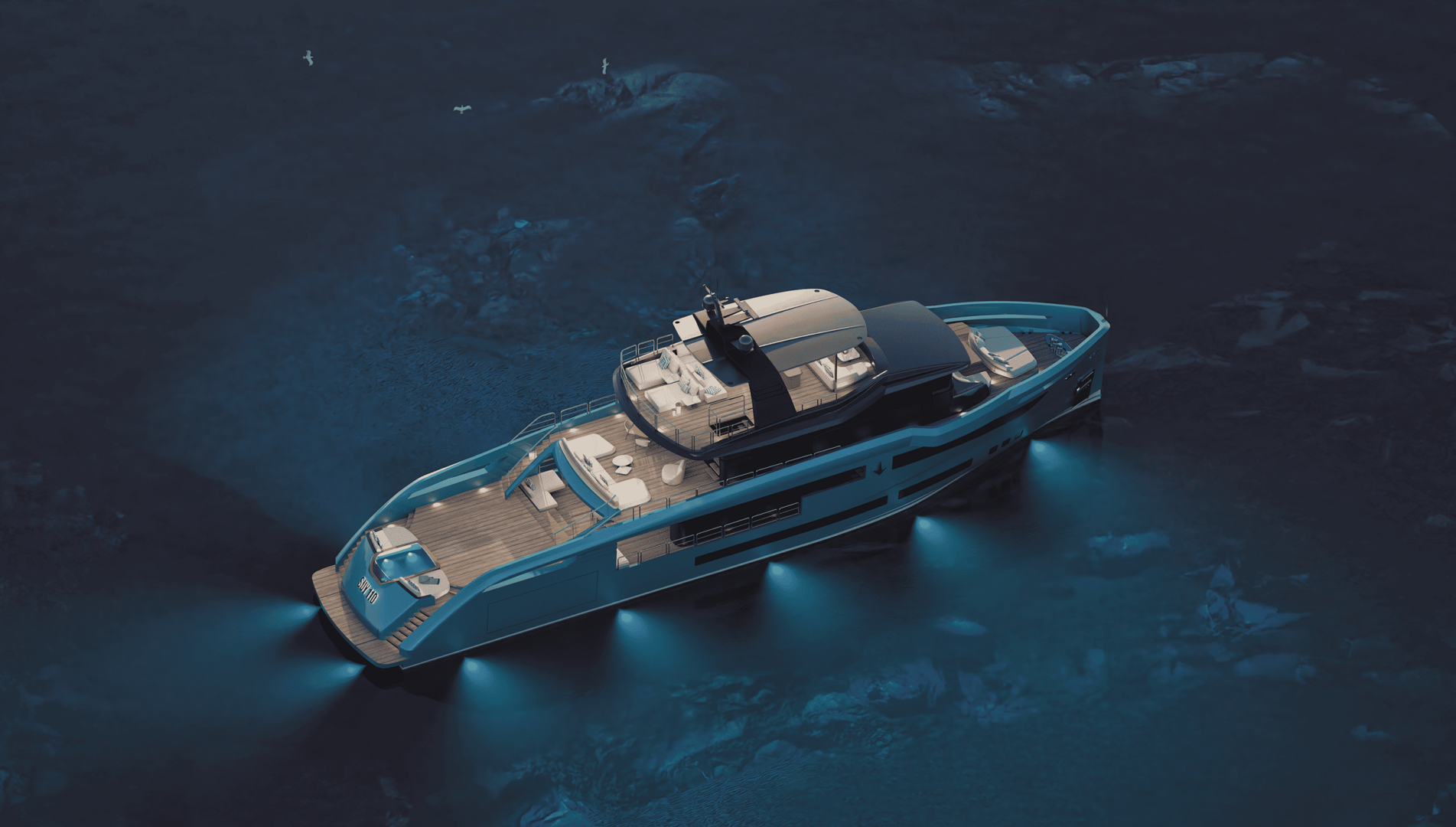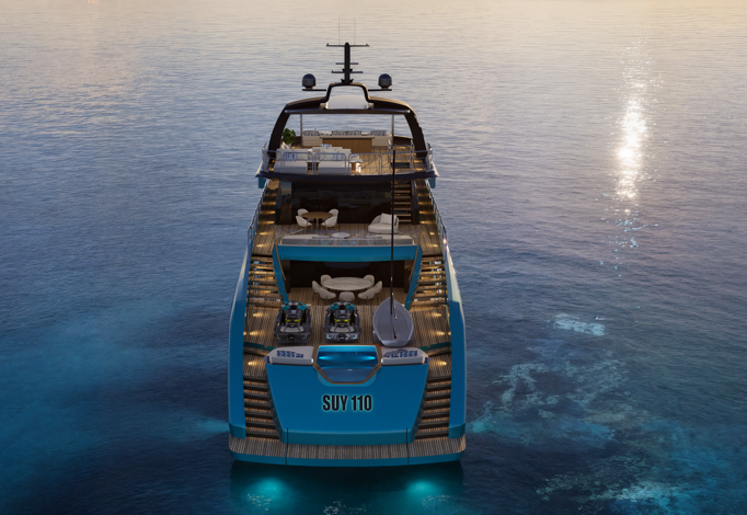 SUY 110 — «спорт-утилити» в стальном формате до 300 GT: размеренная курортная жизнь на палубах, активные сценарии у воды и дальние переходы без лишнего пафоса. LOA 34,0 м; ширина корпуса 7,80 м; осадка ~2,40 м.