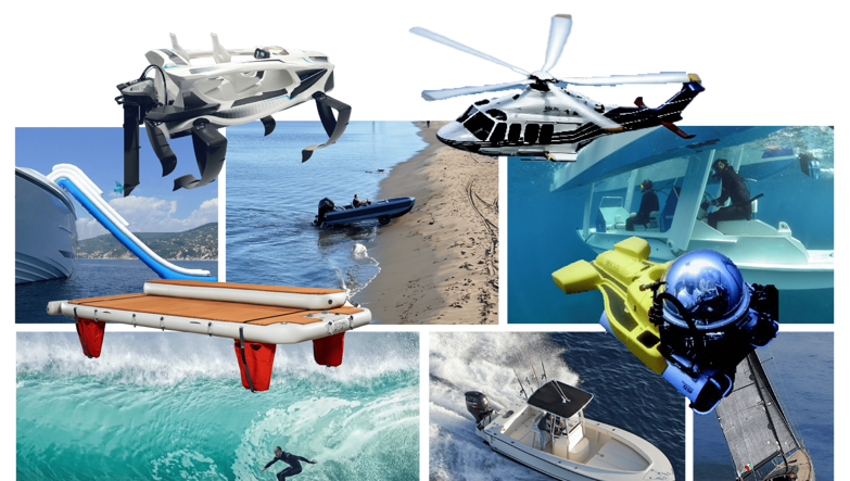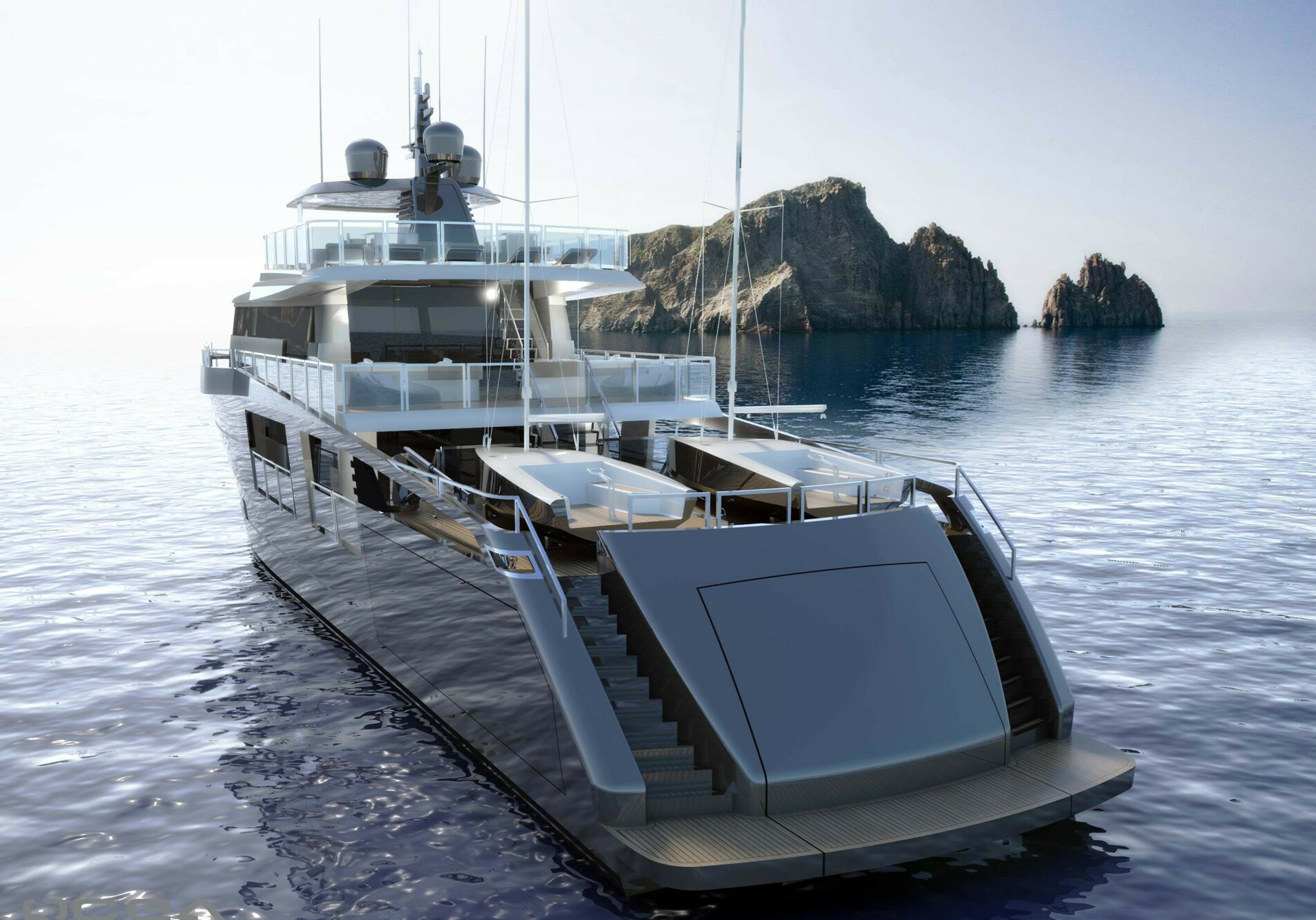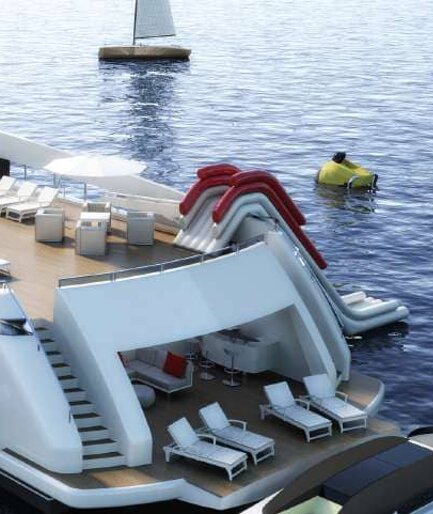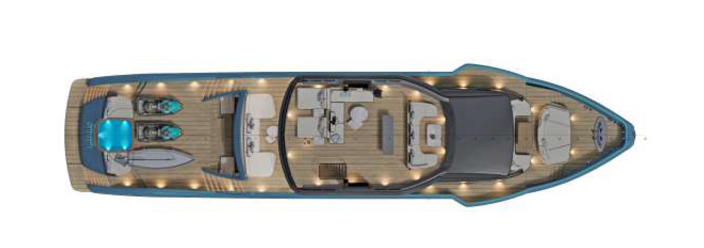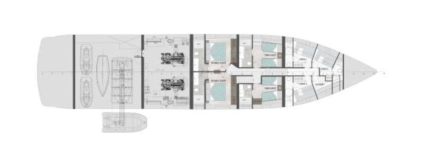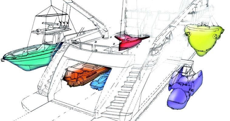 — Ангар/зона игрушек ~50 м²; тендер до ~4,5 м + гидроцикл ~3 м; предусмотрена лодка-помощник/шверт ~4,2 м.