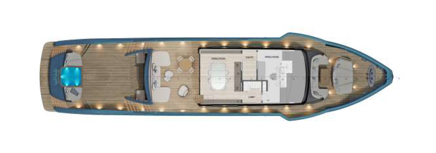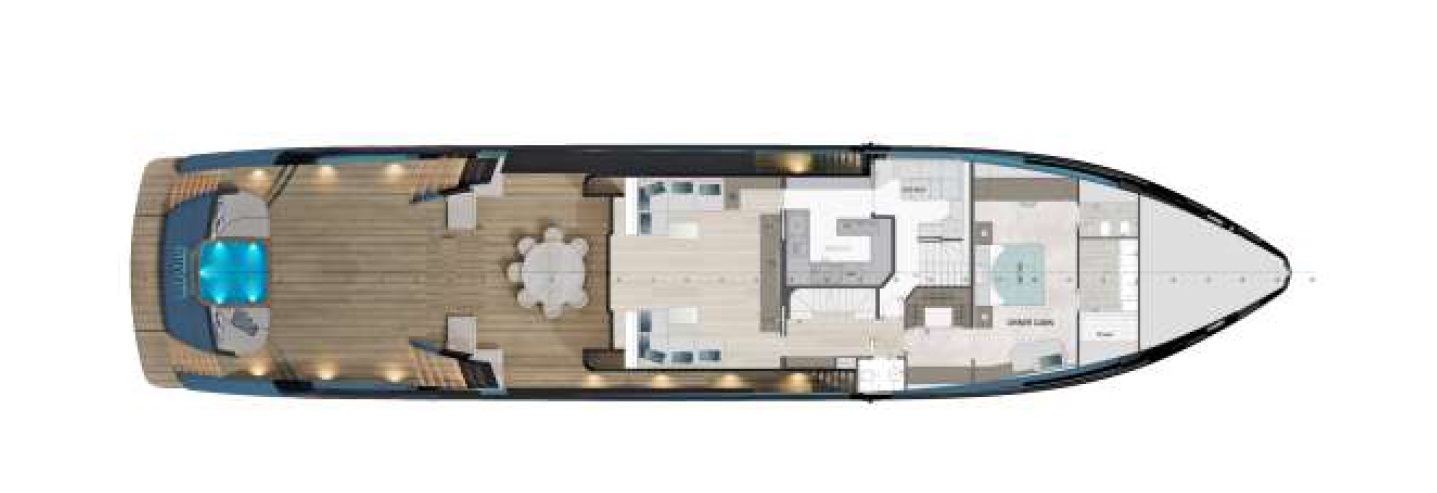 — Носовой лаунж ~26 м² для дневных сценариев и аперитивов.