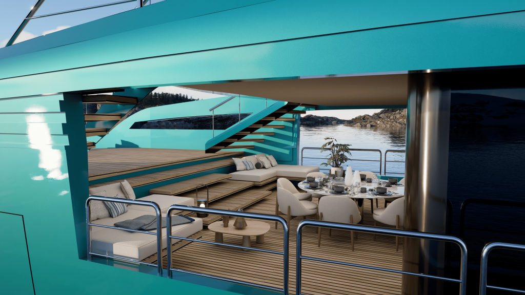 Еще одной отличительной особенностью является инновационная приподнятая терраса, которая может быть использована в качестве пляжного клуба площадью 54 квадратных метра и выходит окнами на гараж, предлагая дополнительное пространство для оборудования или общения на свежем воздухе. Эта зона напрямую соединяется с главной палубой, образуя гостиную-веранду площадью 27 квадратных метров с обеденной зоной и зоной отдыха: одно большое пространство, спроектированное таким образом, чтобы обеспечить комфорт, уединение и гармоничную интеграцию с морской средой. Еще одной отличительной особенностью яхты является легкость соединения различных палуб с помощью семи подъемных и четырех спускных трапов, которые обеспечивают функциональную интеграцию и преемственность между уровнями.