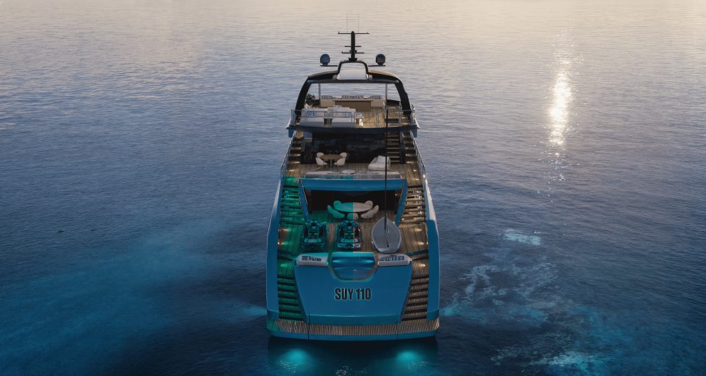 Четырехпалубный SUY110 спроектирован таким образом, чтобы обеспечить максимальный доступ ко всем видам деятельности на борту, и располагает кормовым ангаром площадью 50 квадратных метров, в котором могут разместиться 4,5-метровый тендер, 4,2-метровая парусная лодка (или второй тендер) и два 3-метровых гидроцикла, а также а также каноэ, SUP-доски и другие водные игрушки, не жертвуя при этом внутренним пространством.