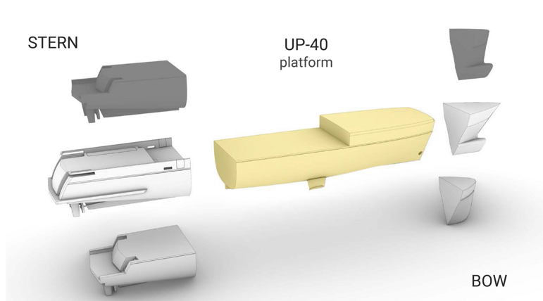 UP-40 (Utility Platform) — это предварительно секционированная модульная платформа для строительства стальных водоизмещающих яхт с алюминиевой надстройкой. Её архитектура позволяет на одной и той же базе реализовывать три концепции — Crossover, Motoryacht и Explorer/Sport, что сокращает сроки, оптимизирует бюджеты и даёт гибкость по внутренним объемам и планировкам. Корпус, обводы и пристраиваемые секции платформы UP-40 прошли статические и динамические испытания в голландском институте MARIN, что подтверждает мореходность и эффективность базовой гидродинамики.